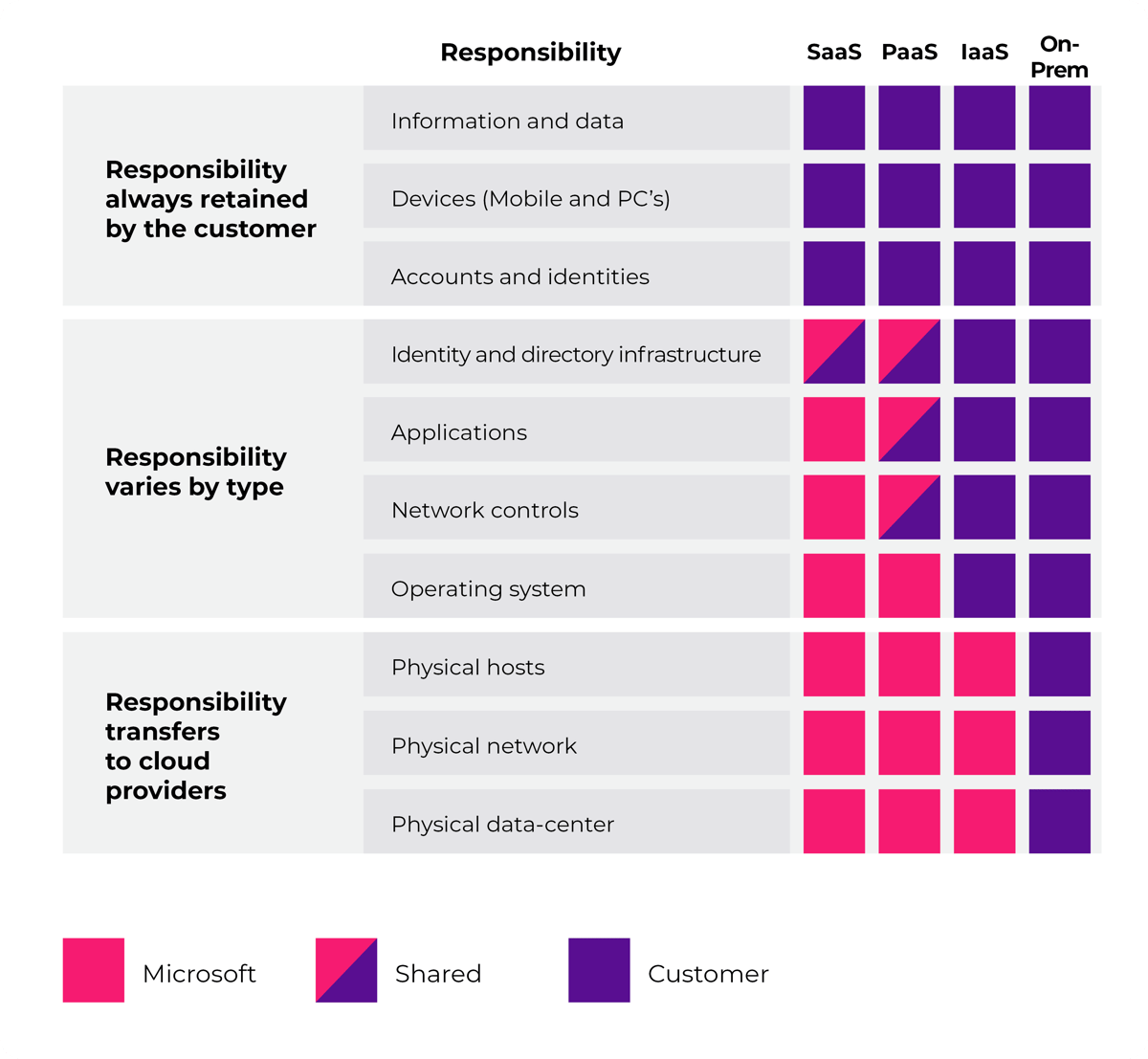 Responsibilities vary based on the type of cloud service being used—whether it’s Software as a Service (SaaS), Platform as a Service (PaaS), Infrastructure as a Service (IaaS), or on-premises environments.